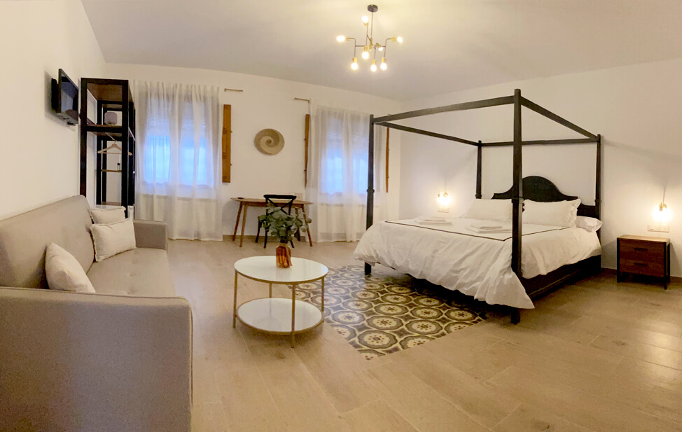 Habitación en planta primera con mezcla de lo antiguo y actual. Dispone de balconera a la terraza y vistas a la piscina.