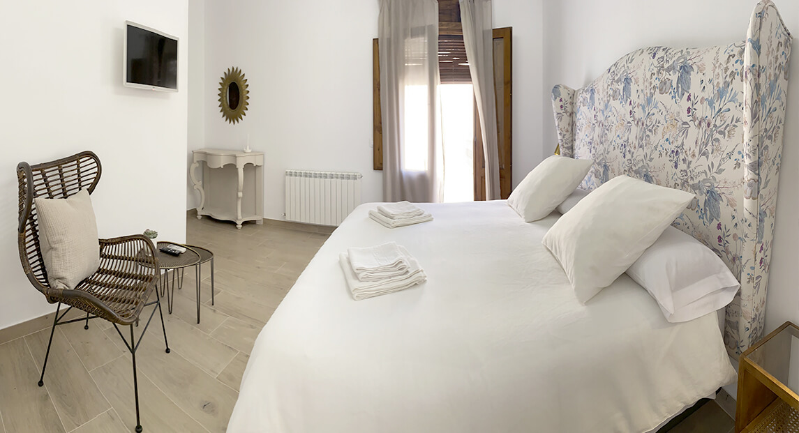 Habitación situada en planta primera, es la que transmite mas paz y relajación. Cuenta con una ventana balconera a la calle.
