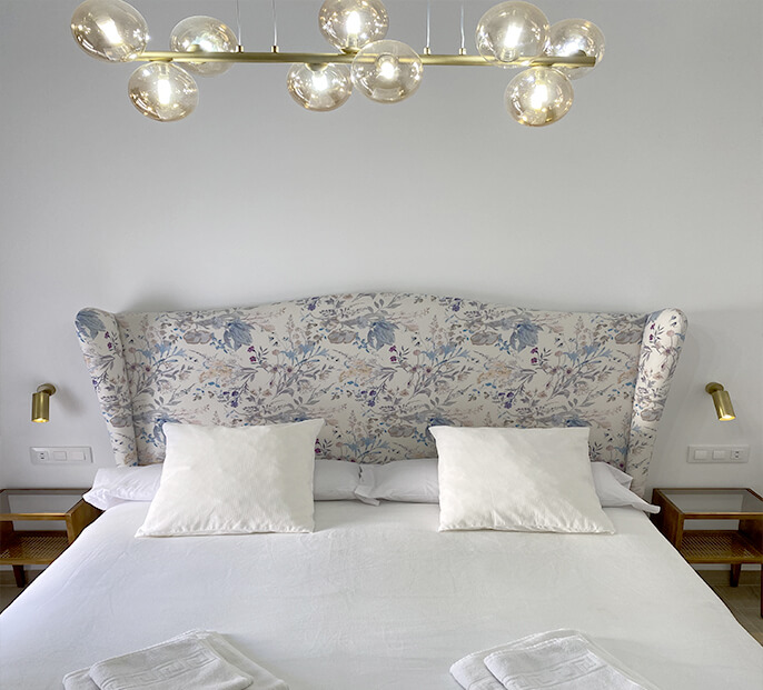Habitación en planta primera con cabeceros de hierro fundido antiguo. Dispone balconera a la terraza y vistas a la piscina.