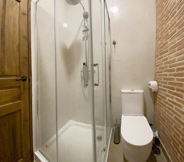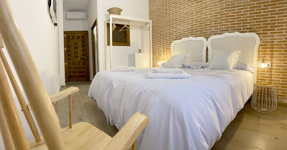 Habitación accesible en planta baja, predomina el frontal de la cama de ladrillo visto. Dispone de ventana con vistas a la calle.