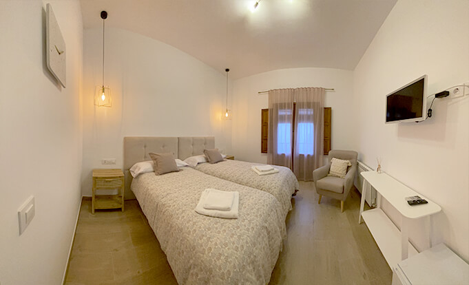Habitación situada en planta primera, es la que transmite mas paz y relajación. Cuenta con una ventana balconera a la calle.