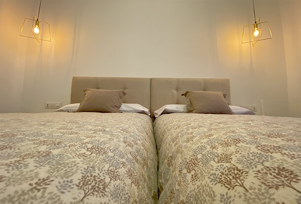 Habitación accesible en planta baja, predomina el frontal de la cama de ladrillo visto. Dispone de ventana con vistas a la calle.